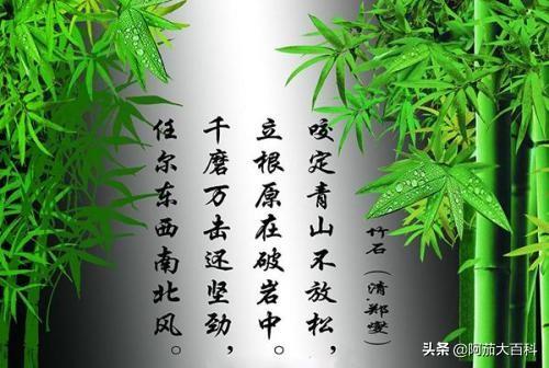如前面提到的“秋风昨夜渡潇湘”这几句,又如:“一阵狂风倒卷来,竹枝翻回向天开。扫云扫雾真吾事,岂屑区区扫地埃。”在这首诗中同样竹子经受着“东西南北风”一年四季的千磨万击。但是由于它深深扎根于岩石之中而仍岿然不动,坚韧刚劲。