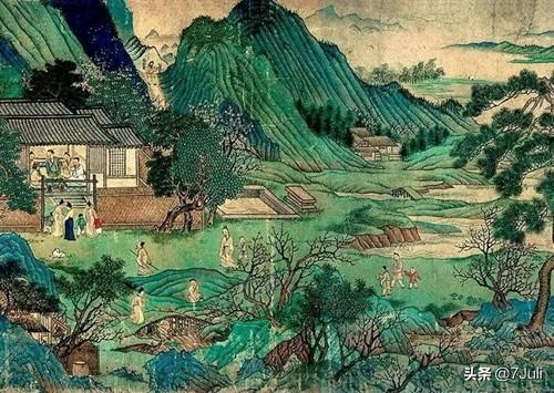 林尽水源,便得一山,山有小口,仿佛若有光。便舍船,从口入。初极狭,才通人。复行数十步,豁然开朗。土地平旷,屋舍俨然,有良田美池桑竹之属。阡陌交通,鸡犬相闻。其中往来种作,男女衣着,悉如外人。黄发垂髫,并怡然自乐。