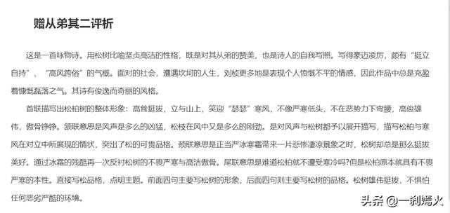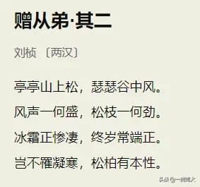 《赠从弟其二》为魏朝词人刘桢所著。作者以松柏为喻,赞颂松柏能够挺立风中而不倒,经严寒而不凋,勉励他的堂弟坚贞自守,不因外力压迫而改变本性。