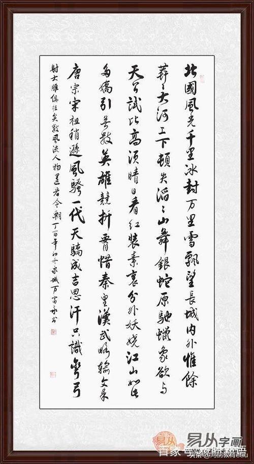 北国风光,千里冰封,万里雪飘。望长城内外,惟余莽莽;大河上下,顿失滔滔。山舞银蛇,原驰蜡象,欲与天公试比高。须晴日,看红装素裹,分外妖娆。江山如此多娇,引无数英雄竞折腰。惜秦皇汉武,略输文采;唐宗宋祖,稍逊风骚。一代天骄,成吉思汗,只识弯弓射大雕。俱往矣,数风流人物,还看今朝。