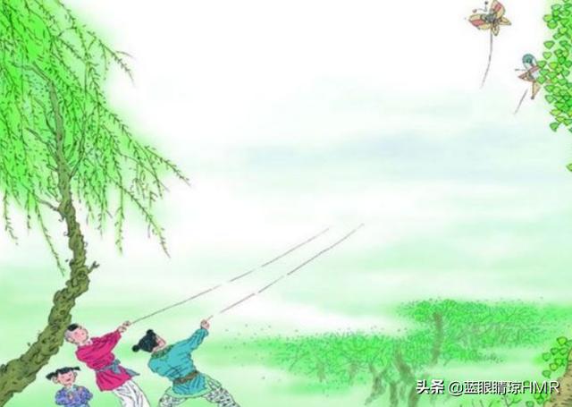 农历二月,村子前后青草渐渐发芽生长,黄莺飞来飞去。杨柳披着长长的绿枝条,随风摆动,好像在轻轻地抚摸着堤岸。在水泽和草木间蒸发的水汽,烟雾般地凝聚着。杨柳似乎为这浓丽的景色所陶醉了。村里的孩子们放学急忙跑回家,趁着东风劲吹的时机,把风筝放上蓝天。