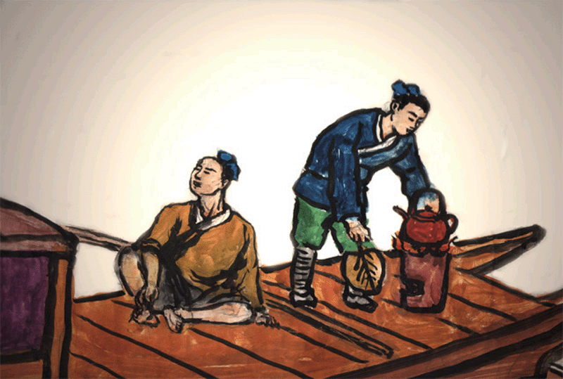 舟尾横卧一楫,楫左右舟子各一人。居右者椎髻仰面,左手倚一衡木,右手攀右趾,若啸呼状;居左者右手执蒲葵扇,左手抚炉,炉上有壶,其人视端容寂,若听茶声然。