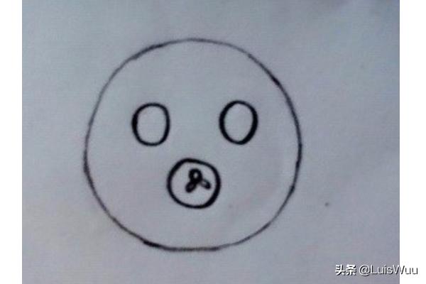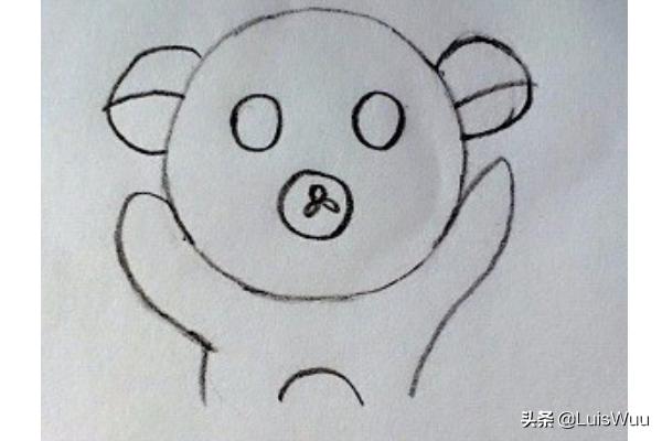 2.在小熊的头部画出三个小小的圆,上面两个是眼睛,下面一个是嘴巴。注意在下面的一个圆里画出一个三尖状。